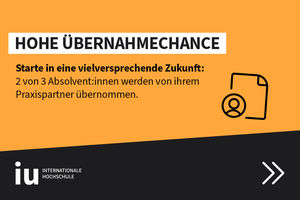 - Höchste Qualität in der Lehre: Dank der IU blickst Du in eine vielversprechende Zukunft. 2 von 3 Absolvent:innen werden von ihrem Praxispartner übernommen. Alle Studiengänge sind staatlich anerkannt.